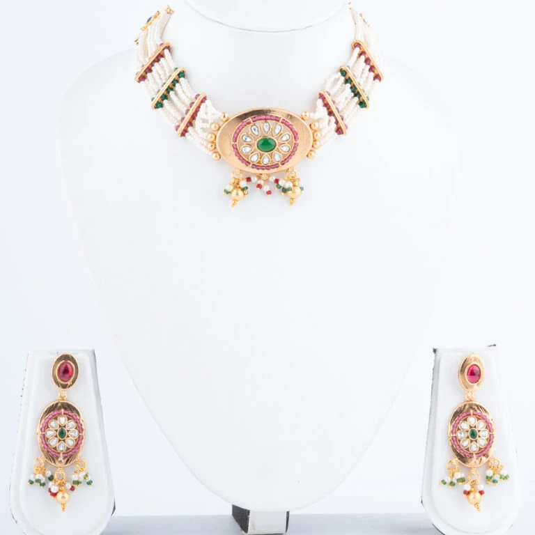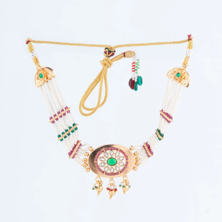 Our Rajwadi Necklace Set embodies the opulence and grandeur of India’s royal heritage. Intricately crafted to reflect traditional Rajputana artistry, this set features a statement necklace paired with matching earrings, each piece carefully designed to bring a regal touch to your attire. The vibrant gemstones and fine detailing create a timeless piece that celebrates classic Indian elegance.