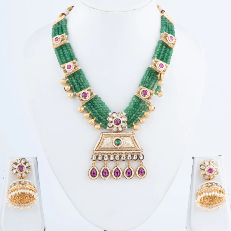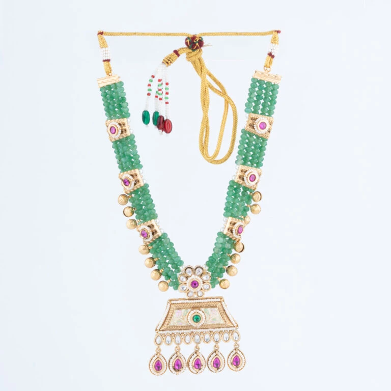 Our Rajwadi Necklace Set embodies the opulence and grandeur of India’s royal heritage. Intricately crafted to reflect traditional Rajputana artistry, this set features a statement necklace paired with matching earrings, each piece carefully designed to bring a regal touch to your attire. The vibrant gemstones and fine detailing create a timeless piece that celebrates classic Indian elegance.