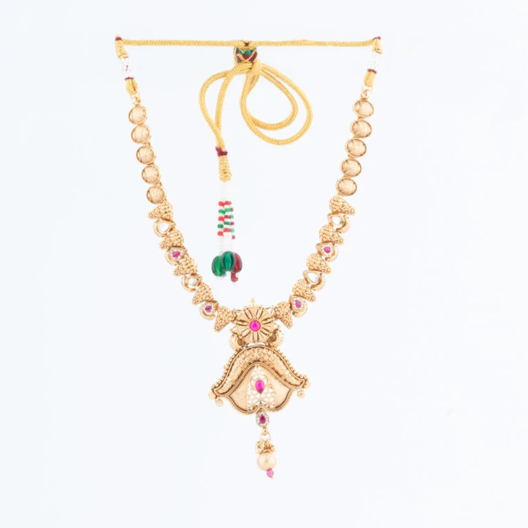 Our Rajwadi Necklace Set embodies the opulence and grandeur of India’s royal heritage. Intricately crafted to reflect traditional Rajputana artistry, this set features a statement necklace paired with matching earrings, each piece carefully designed to bring a regal touch to your attire. The vibrant gemstones and fine detailing create a timeless piece that celebrates classic Indian elegance.