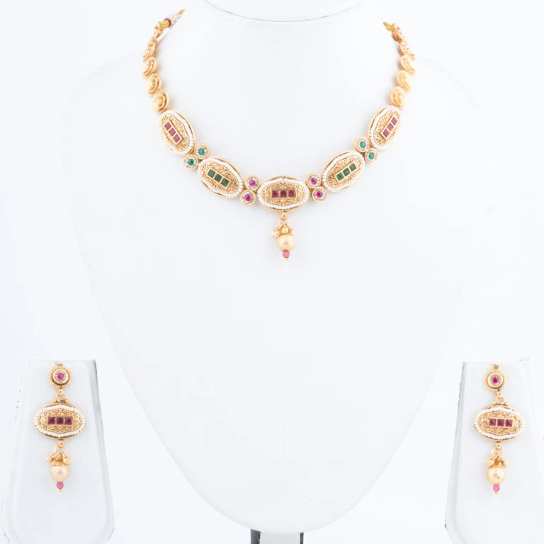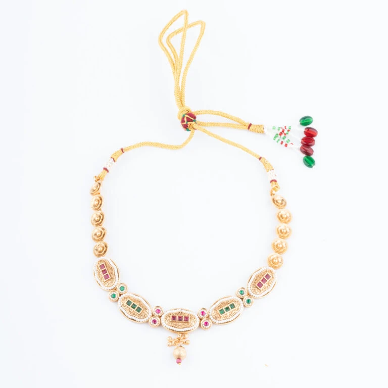 Our Rajwadi Necklace Set embodies the opulence and grandeur of India’s royal heritage. Intricately crafted to reflect traditional Rajputana artistry, this set features a statement necklace paired with matching earrings, each piece carefully designed to bring a regal touch to your attire. The vibrant gemstones and fine detailing create a timeless piece that celebrates classic Indian elegance.