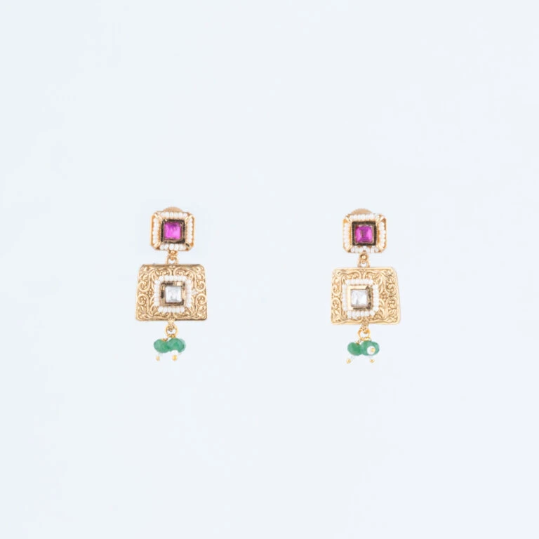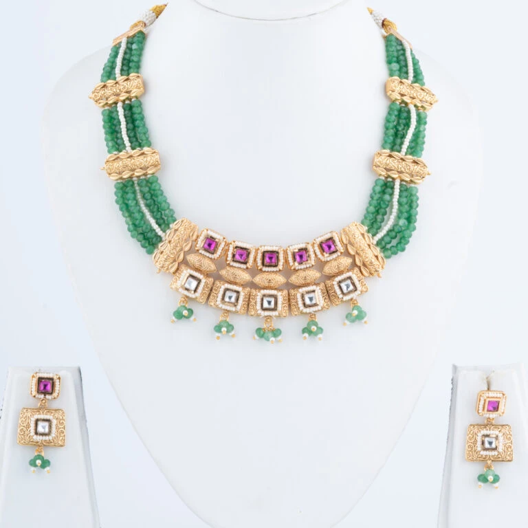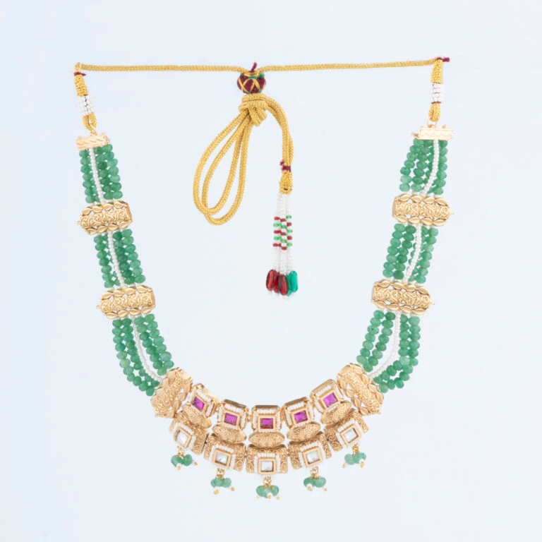 Our Rajwadi Necklace Set embodies the opulence and grandeur of India’s royal heritage. Intricately crafted to reflect traditional Rajputana artistry, this set features a statement necklace paired with matching earrings, each piece carefully designed to bring a regal touch to your attire. The vibrant gemstones and fine detailing create a timeless piece that celebrates classic Indian elegance.