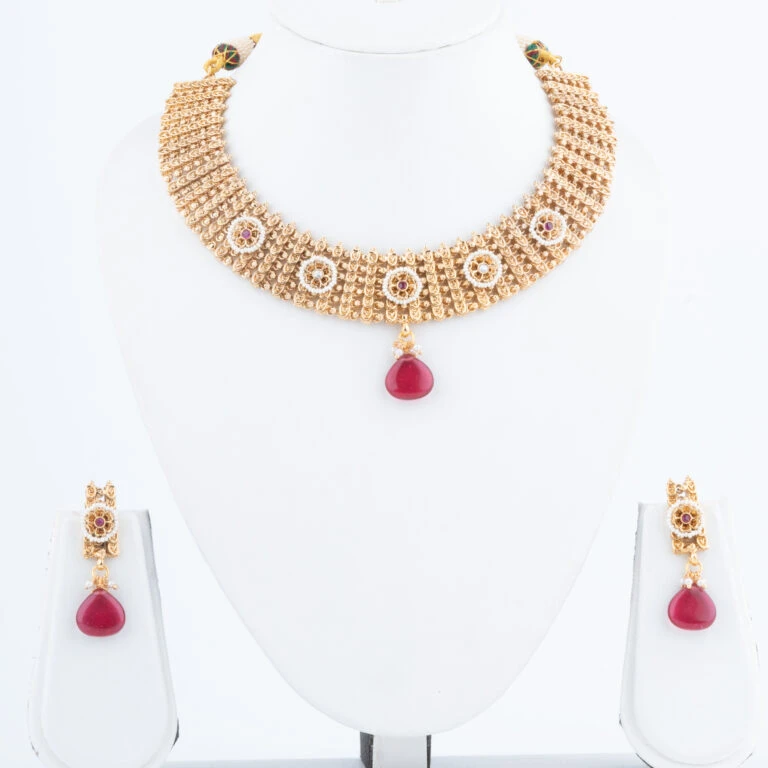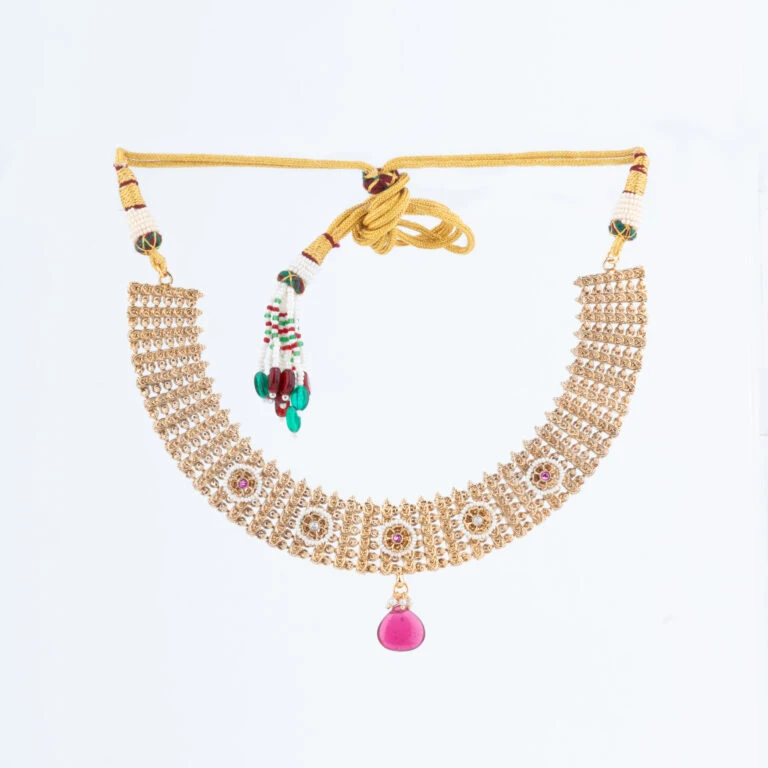 Our Rajwadi Necklace Set embodies the opulence and grandeur of India’s royal heritage. Intricately crafted to reflect traditional Rajputana artistry, this set features a statement necklace paired with matching earrings, each piece carefully designed to bring a regal touch to your attire. The vibrant gemstones and fine detailing create a timeless piece that celebrates classic Indian elegance.