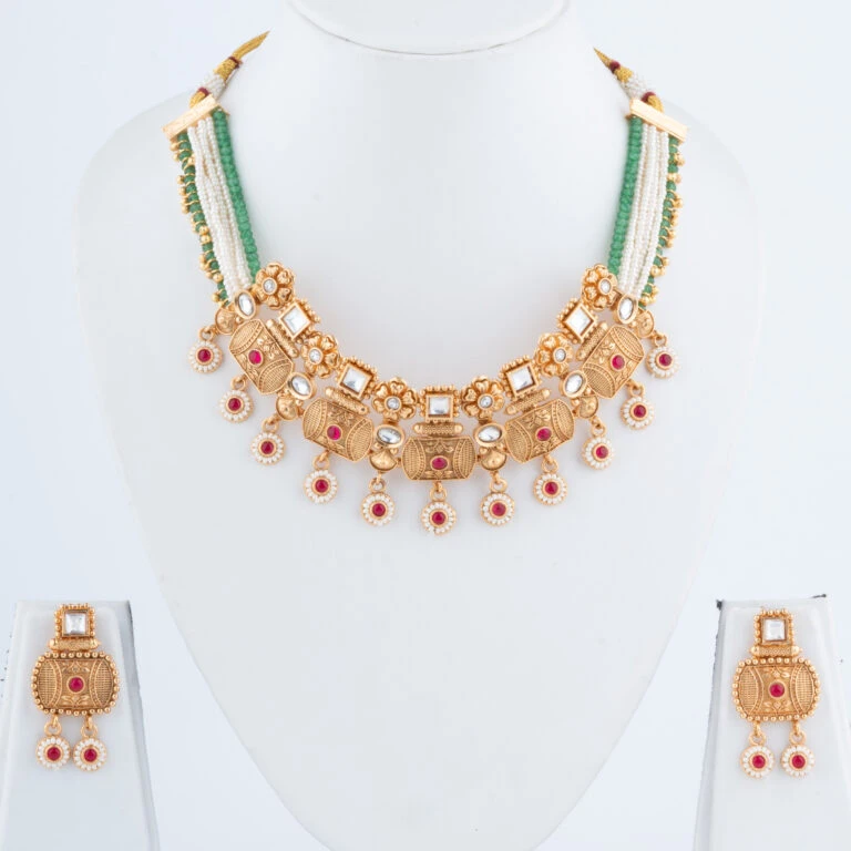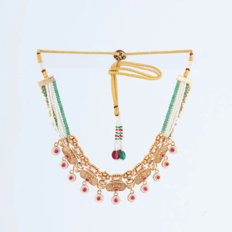 Our Rajwadi Necklace Set embodies the opulence and grandeur of India’s royal heritage. Intricately crafted to reflect traditional Rajputana artistry, this set features a statement necklace paired with matching earrings, each piece carefully designed to bring a regal touch to your attire. The vibrant gemstones and fine detailing create a timeless piece that celebrates classic Indian elegance.