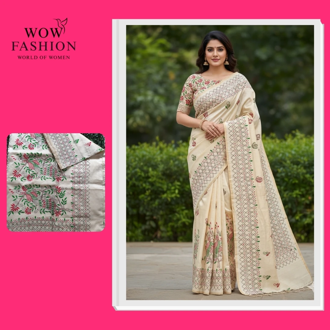 Grace meets tradition in this cream silk cotton saree, adorned with intricate Kantha hand embroidery in vibrant red and green threads. The artistic floral and peacock-inspired patterns highlight heritage craftsmanship, while the soft silk-cotton blend ensures a lightweight and graceful drape. Perfect for festive occasions, family gatherings, or casual ethnic wear.