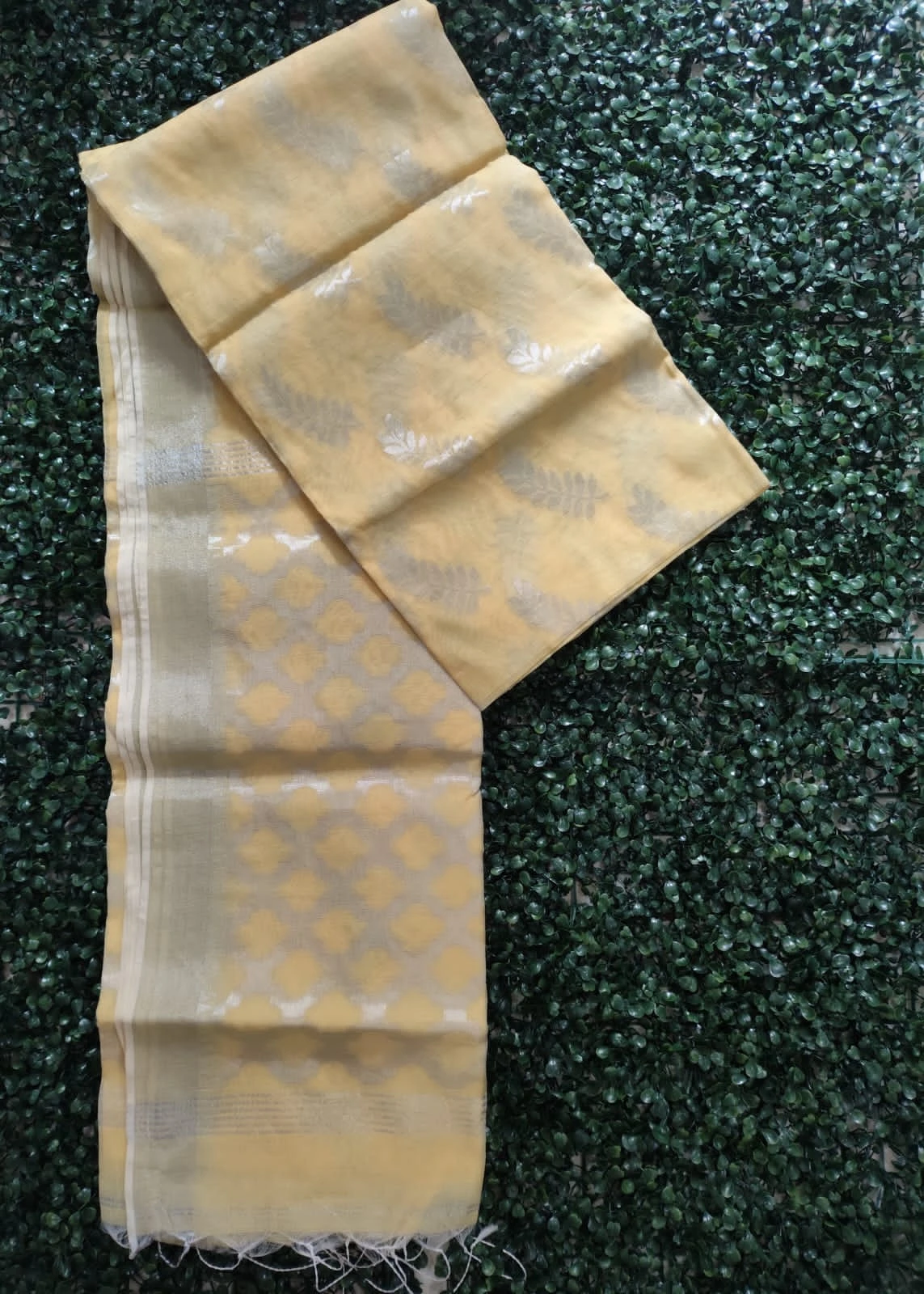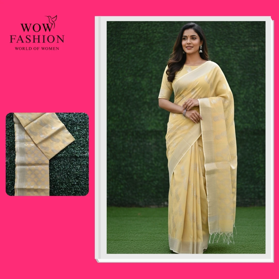 Graceful and elegant, this pure khadi cotton saree in soft light yellow shade features a rich golden-silver pallu and intricate woven motifs. Handcrafted from premium quality handspun cotton, it offers a natural texture, breathable comfort, and a sophisticated drape. Ideal for festive occasions, cultural events, and traditional celebrations.