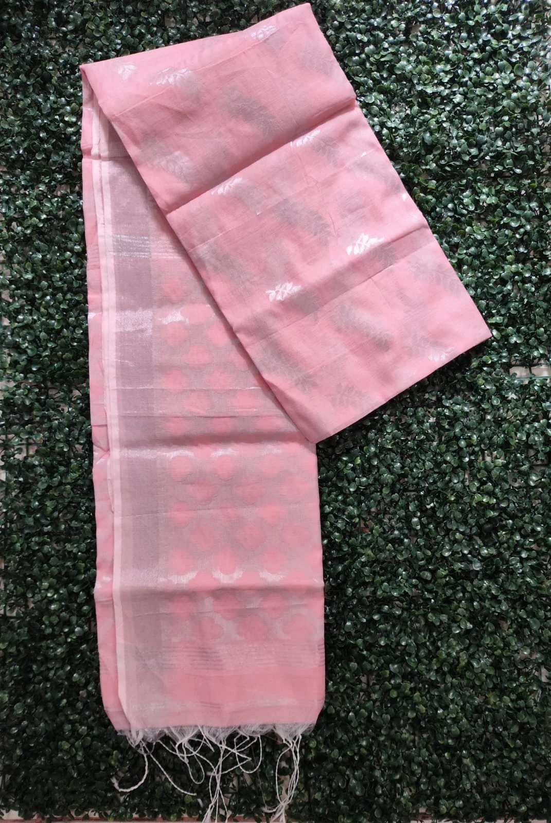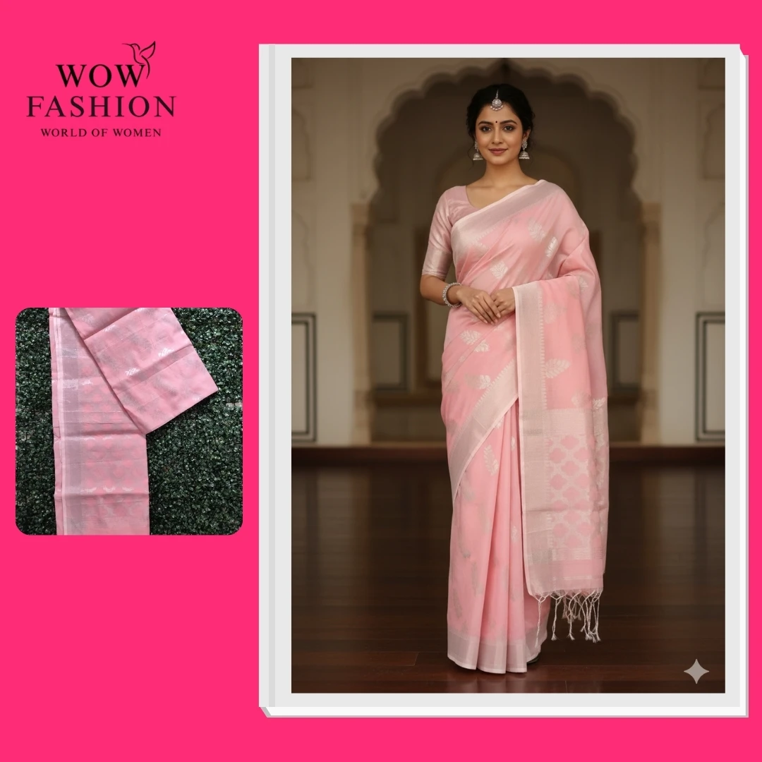 Add elegance to your ethnic collection with this soft pink handwoven saree featuring delicate silver zari motifs throughout. Crafted with finesse, this saree showcases a perfect blend of tradition and sophistication. The subtle floral zari weaving enhances its charm, while the light fabric ensures comfort for long wear. Ideal for festive occasions, weddings, or graceful evening gatherings. Pair it with silver jewelry for a timeless, graceful look.